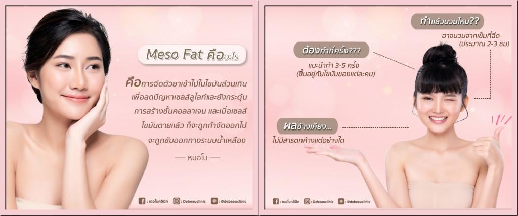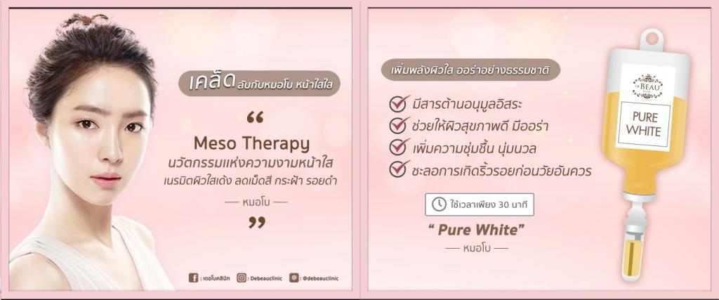MesoTherapy คือ การฉีดวิตามินบำบัดเฉพาะจุด เพื่อผิวขาวใส แก้ปัญหาฝ้า กระ รักษาสิว สลายไขมัน โดยการใช้เข็มขนาดเล็ก ประมาณ 27-30 G (เล็กกว่าก้านดอกเข็ม) ฉีดสารอาหารต่างๆ ที่จำเป็นต่อสุขภาพผิว เช่น วิตามิน Coenzyme Q10 แร่ธาตุ และกรดอะมิโน เข้าสู่ผิวหนังชั้นในโดยตรง